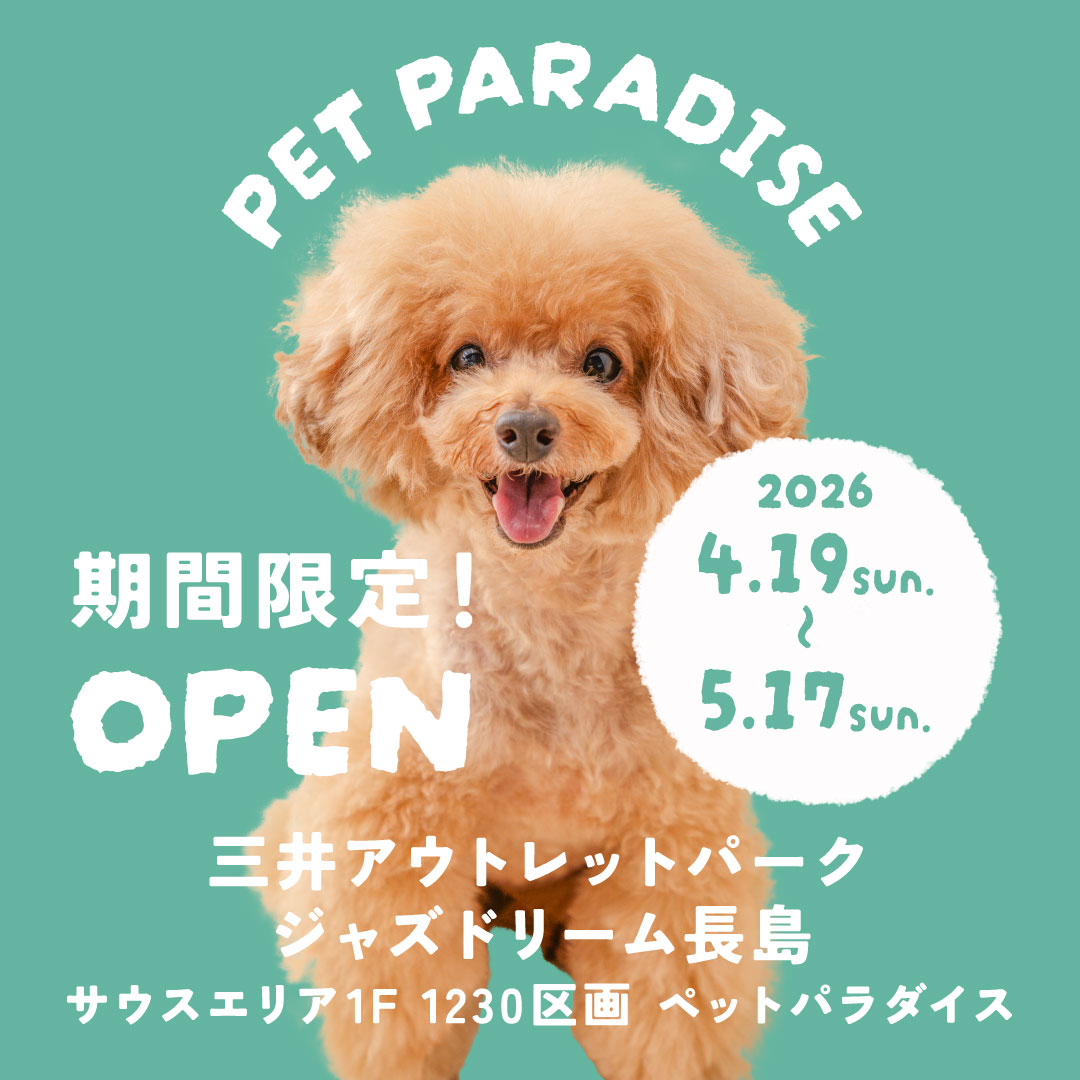2026.4.19(日)三井アウトレットパーク ジャズドリーム長島 サウスエリア1F 1230区画に「ペットパラダイス 三井アウトレットパーク ジャズドリーム長島店」を期間限定オープンいたします。