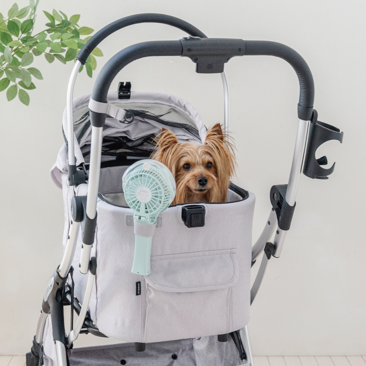 3 段階の風とミストの気化熱で涼しさアップ。カートに装着することで、内部の熱のこもりを防ぎます。