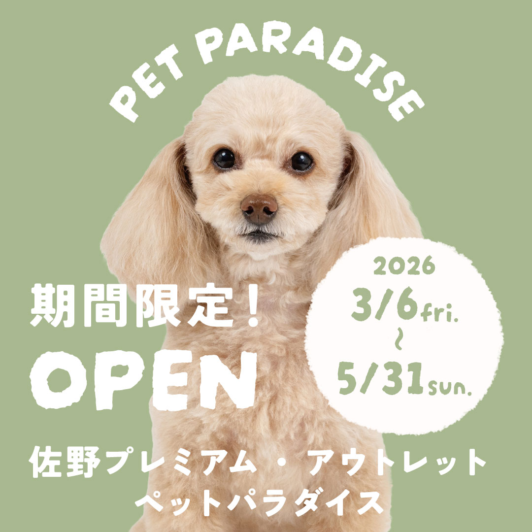 2026年3月6日(金)栃木県佐野市の商業施設佐野プレミアム・アウトレット555区Premium Event Spaceに「ペットパラダイス 佐野プレミアム・アウトレット店」を2026年5月31日(日)まで期間限定オープンいたします。